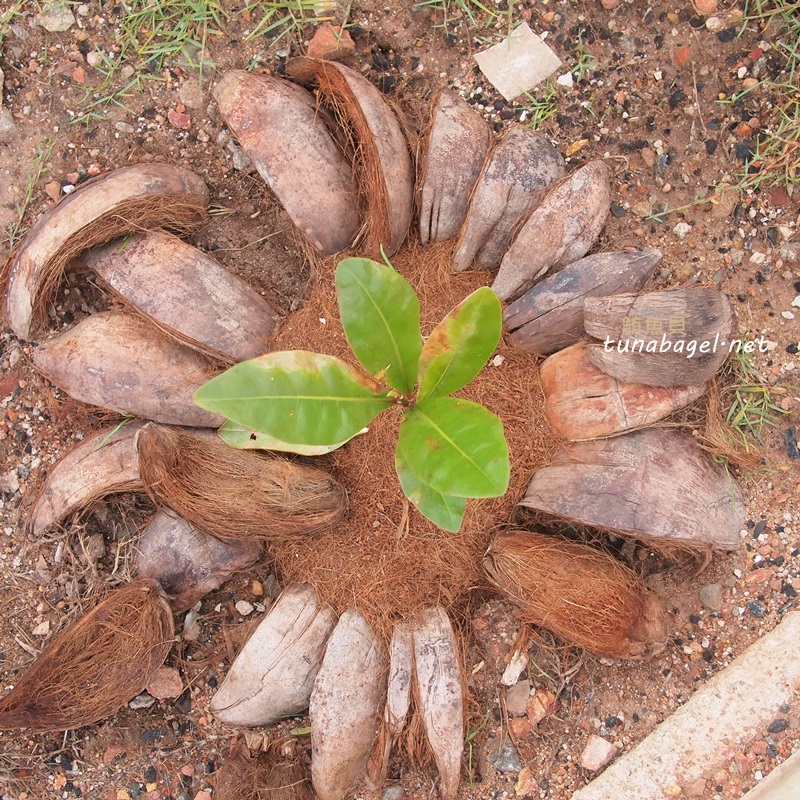 蘭卡到處看得到被椰子殼環繞的樹苗,據說能夠保持周圍土壤溼潤,當然本身也是一種肥料。此外,蘭卡朋友說,這些椰子殼象徵最新一次豐收。