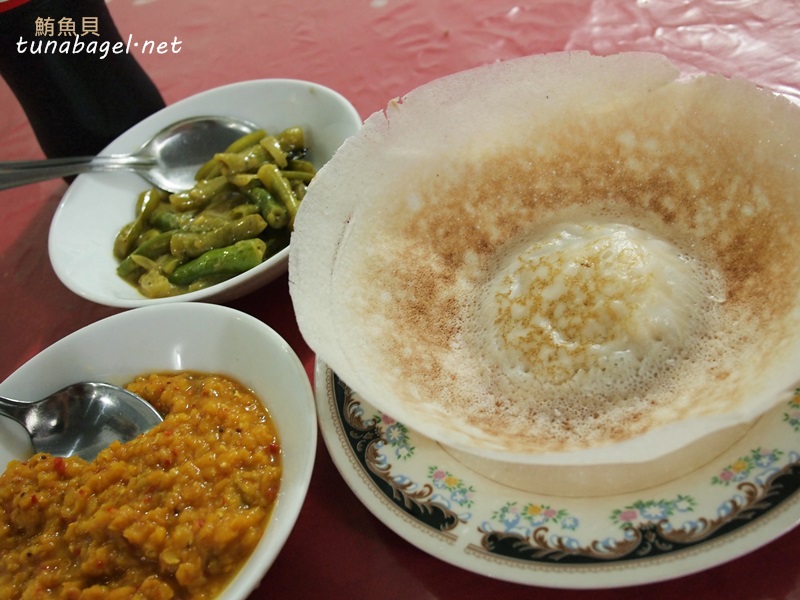 這是我用鼻子找到的第一家餐廳,那個碗狀煎餅叫 Hoppers,是用米漿和椰奶去調的,很香很純樸好吃。碗壁是脆的,底下軟軟像荷包蛋的東西我原本以為是蛋,所以一開始還跟老闆點了雞蛋,還好有位大學生解救我的愚蠢。
