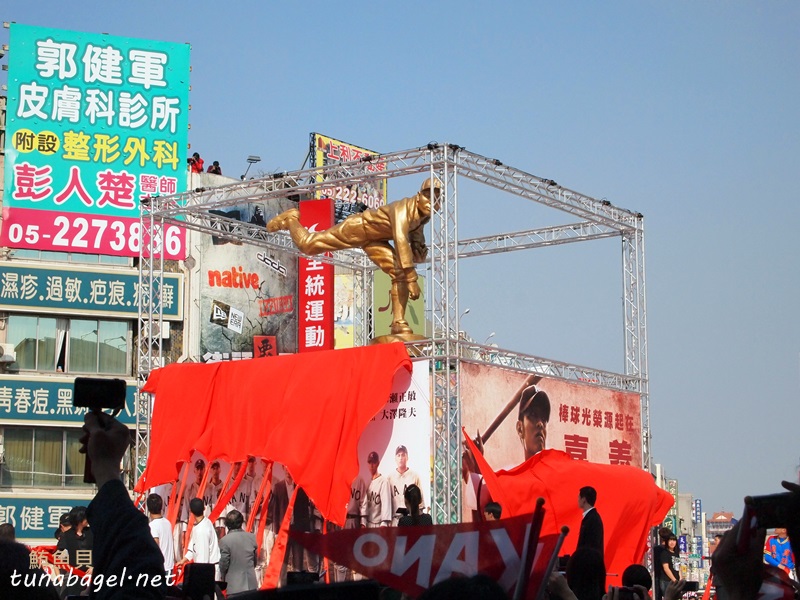 圓環揭幕儀式的對象是座投手雕像。話說要取得甲子園代表權,得先打敗台灣區的所有校隊,嘉農隊據說從來沒贏過任何比賽,最後能去甲子園還贏得『天下嘉農』的喝采,算是魯蛇翻身,真想看看這電影有多勵志。