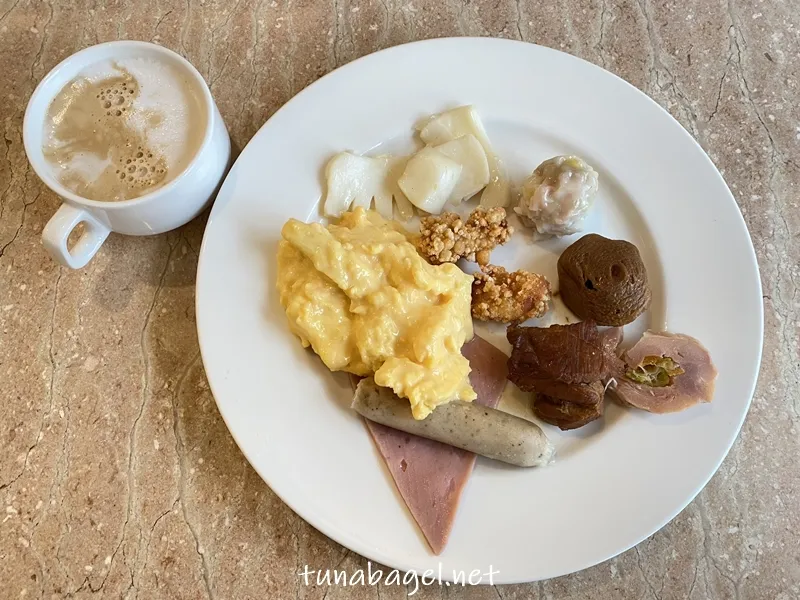 早餐吃到飽的菜色有夠多,先喝一杯拿鐵壓壓驚,