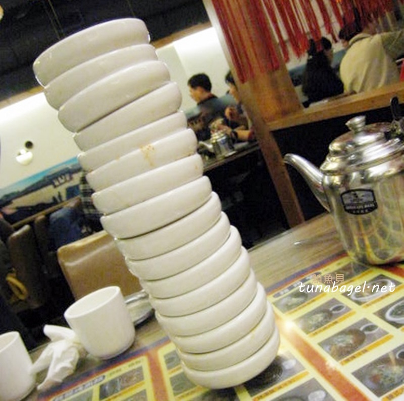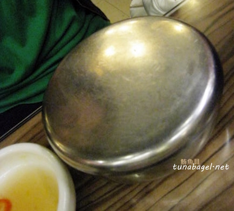 銅盤下面是卡式爐,瓦斯沒了可以請小二來換。隔壁桌是吃鐵盤烤肉,差別是銅盤可以火烤兩吃,鐵盤就都吃烤肉。不過雖然肉汁會順著銅盤往下流,但效果不彰,湯的味道依然淡而無味。於是我們就把盤子裡剩下的醃肉醬汁全倒了進去,煮一煮之後才有味道。不過當時我們三人到底是哪來的勇氣,居然把那加了有的沒的湯給喝下去!?