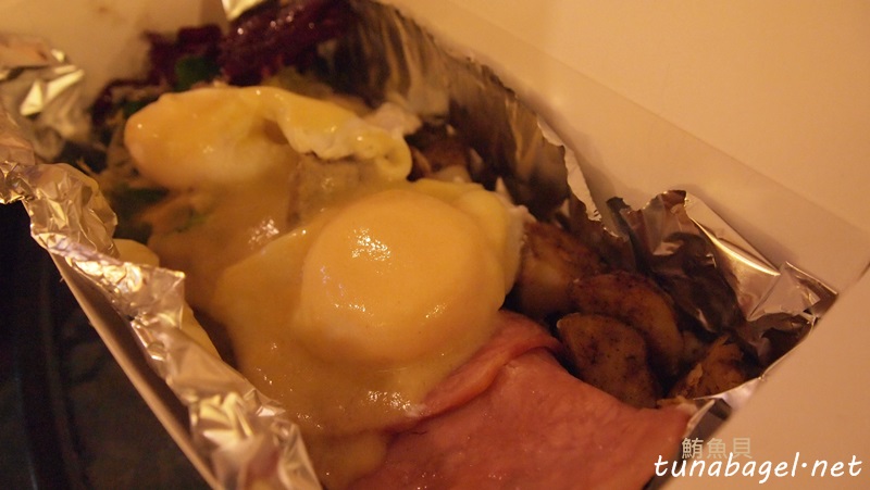 這是人妻的火腿班尼迪克蛋早餐,是把雞蛋打在沸水中,維持蛋包形狀煮半熟後,淋上荷蘭醬的餐點,人妻說好好吃歐。附餐有比斯吉、火腿、馬鈴薯,還有飲料。