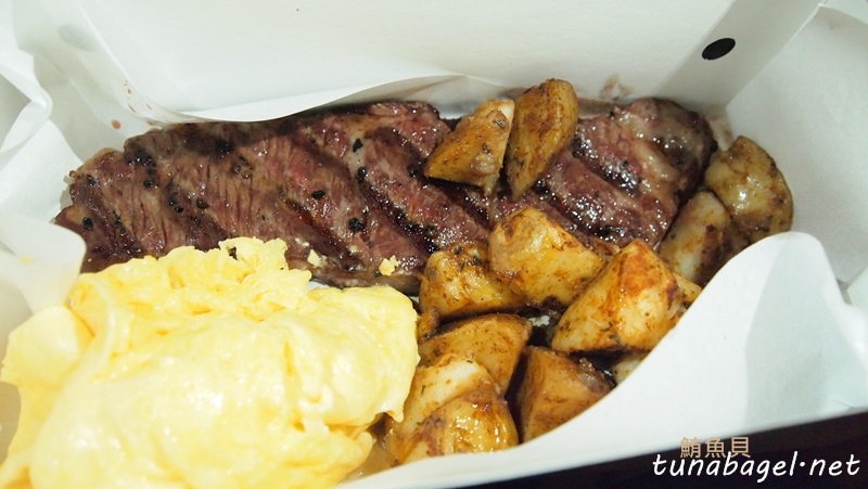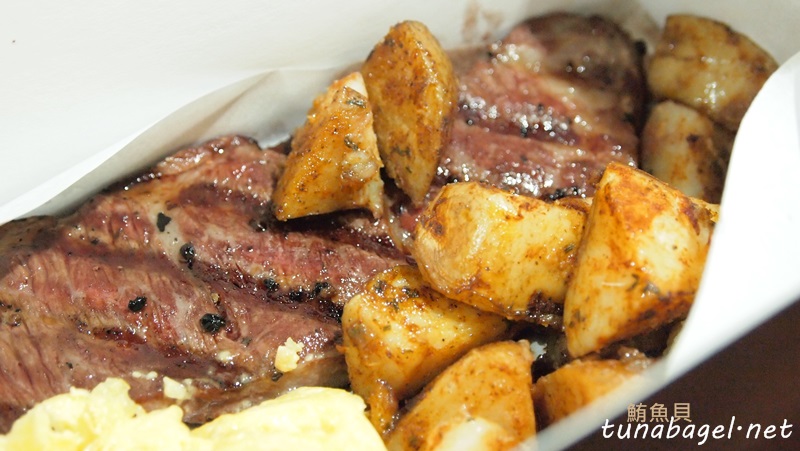 然後是夢寐以求的嫩肩牛排組合早餐,好大一塊牛排!五分熟的牛排吃起來又嫩又多汁,味道超棒,整個心情大好!附餐有炒蛋,帶著奶油香味,不過加點鹽會更好XD另外有馬鈴薯、熱咖啡,還有份量讓我抖了好幾下的鬆餅。