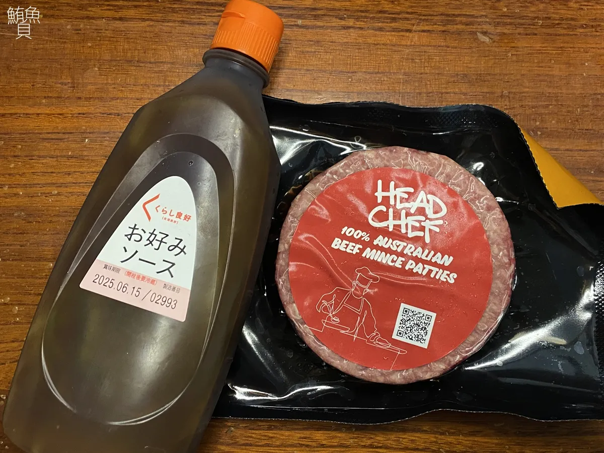 請到需要支援收銀的超市找兩種材料:圓形真空包裝牛絞肉、大阪燒醬